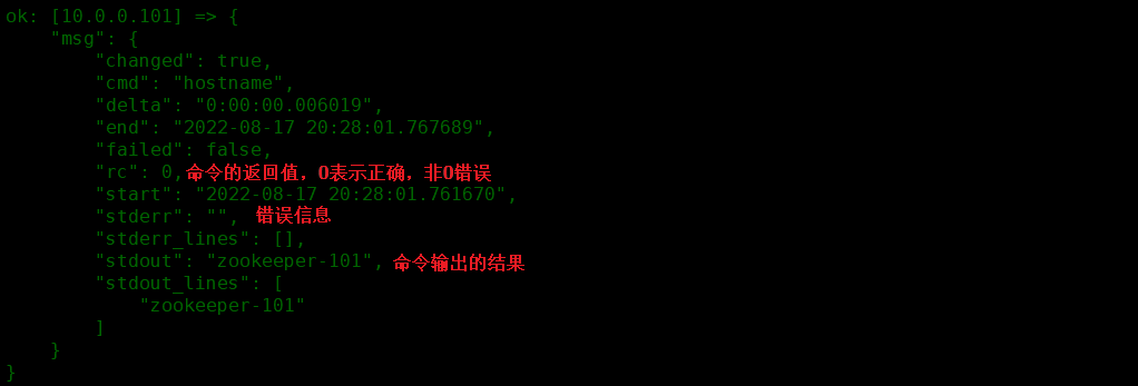 register: hostname # json格式,只想要输出标准输出 stdout standard output 标准输出.