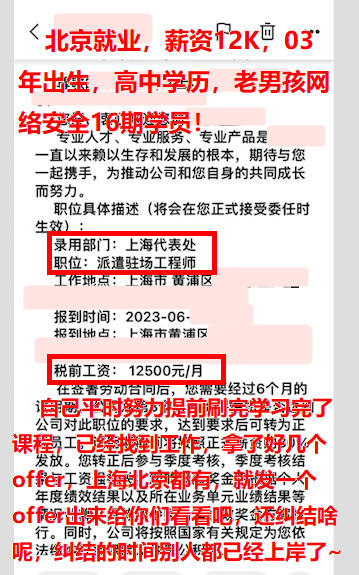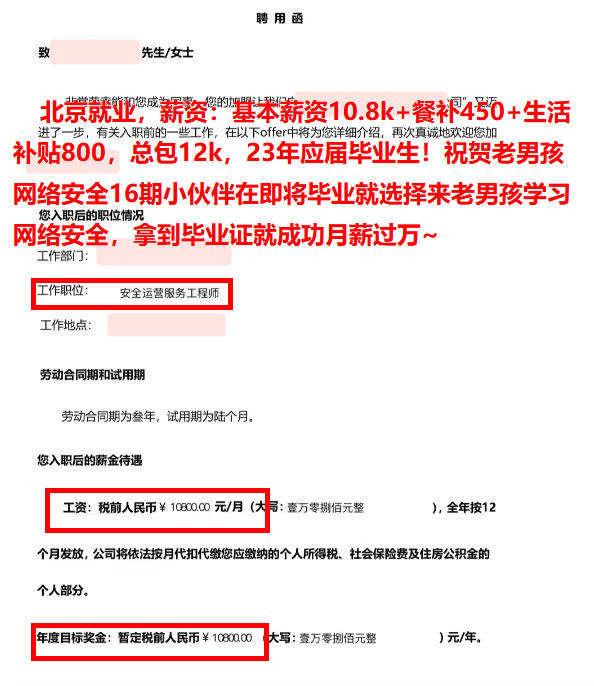 北京就业,薪资:基本薪资10.8k+餐补450+生活补贴800,总包12k,23年应届毕业生!祝贺老男孩网络安全16期小伙伴在即将毕业就选择来老男孩学习网络安全,拿到毕业证就成功月薪过万~