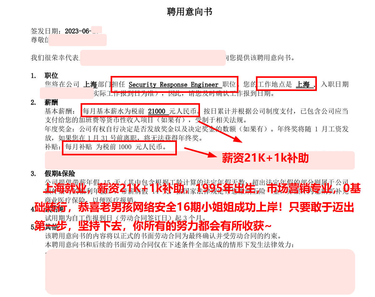 上海就业,薪资21K+1k补助,1995年出生,市场营销专业,0基础转行,恭喜老男孩网络安全16期小姐姐成功上岸!只要敢于迈出第一步,坚持下去,你所有的努力都会有所收获~