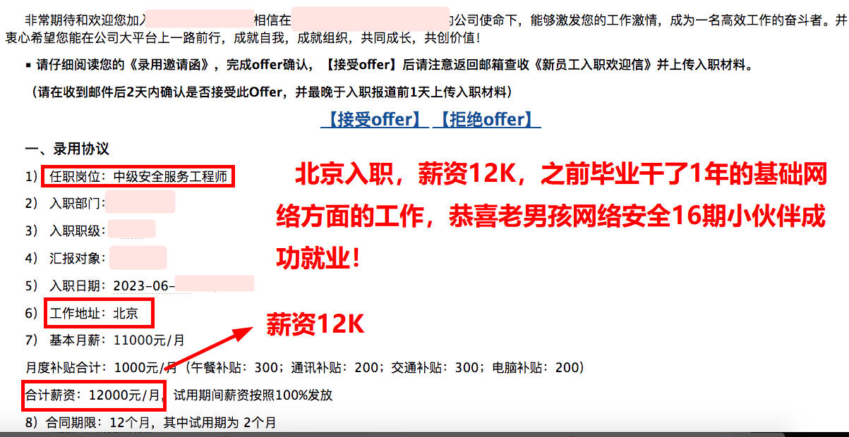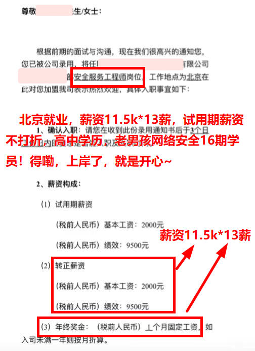 北京就业,薪资11K,2000年出生,高中学历,老男孩网络安全16期学员!offer+护网都没耽误,搞钱的事情必须都要~