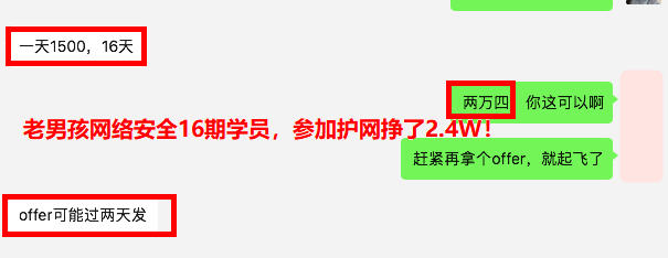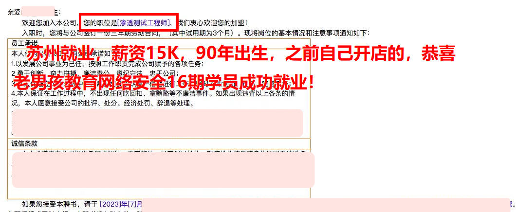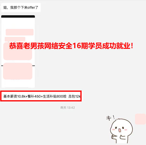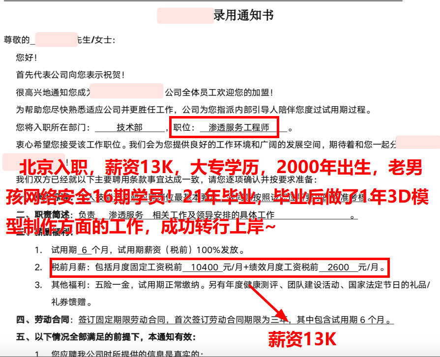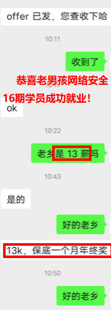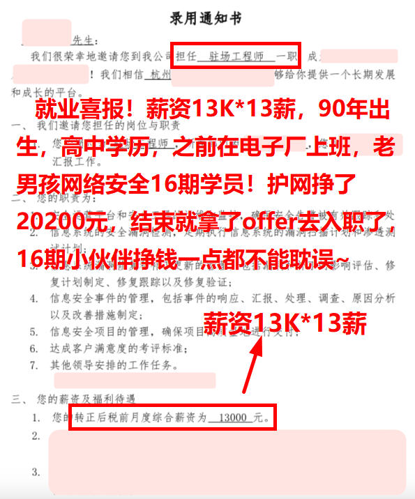 就业喜报!薪资13K*13薪,90年出生,高中学历,之前在电子厂上班,老男孩网络安全16期学员!护网挣了20200元,结束就拿了offer去入职了,16期小伙伴挣钱一点都不能耽误~