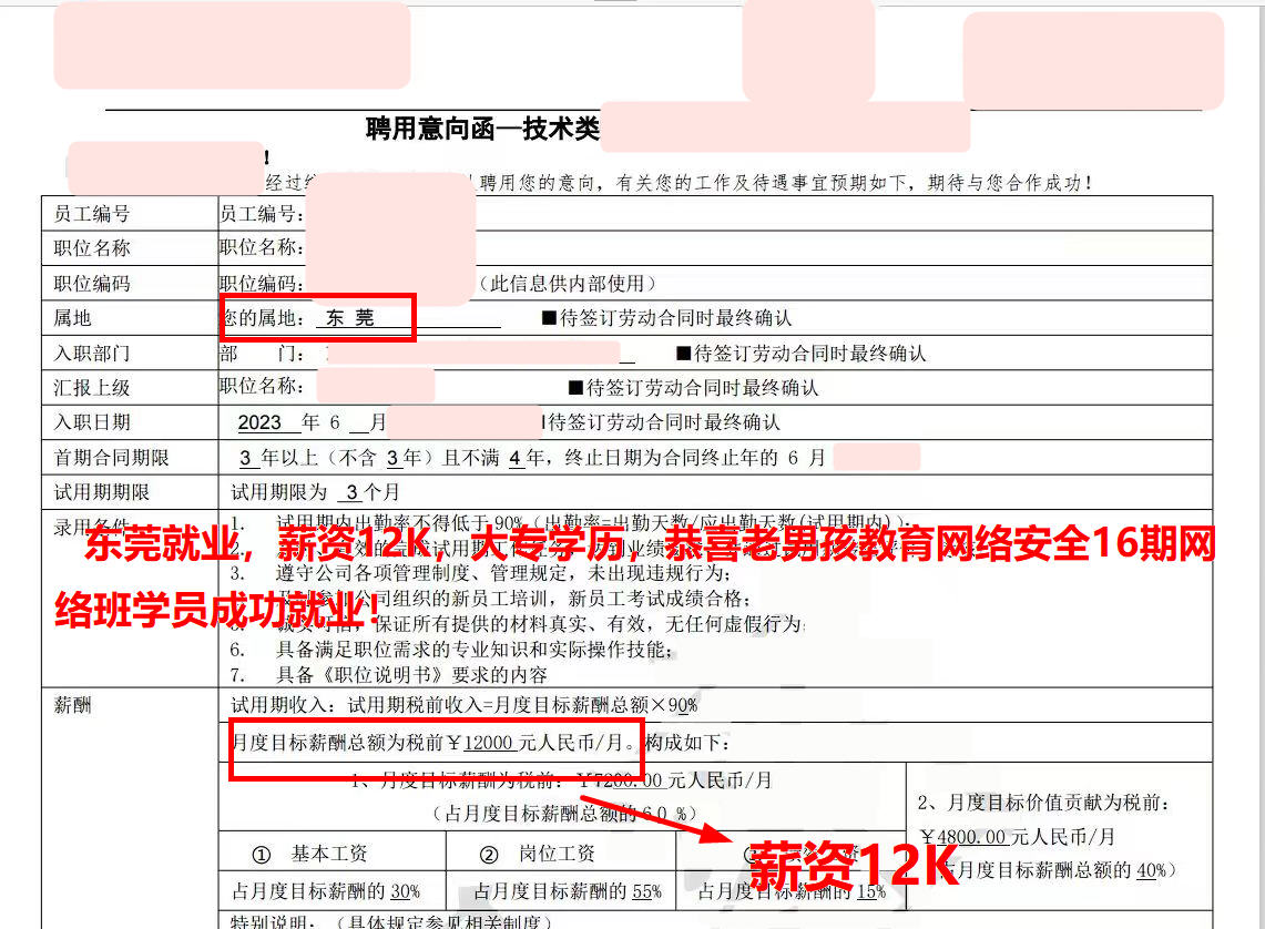 东莞就业,薪资12K,大专学历,恭喜老男孩教育网络安全16期网络班学员成功就业!