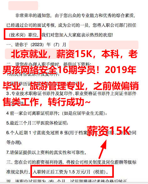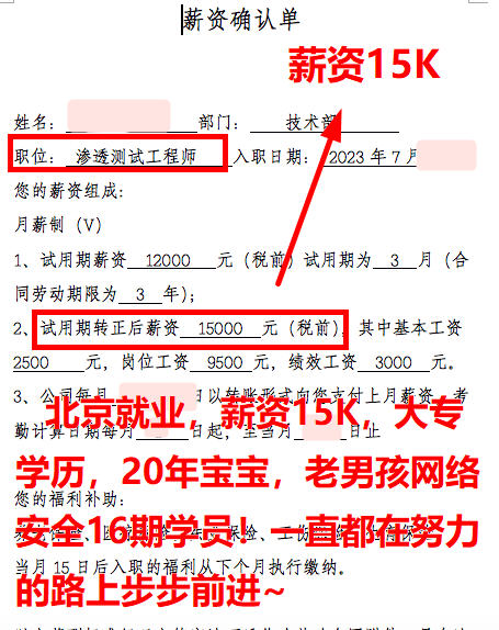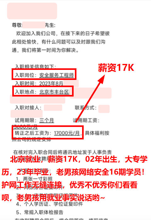 北京就业,薪资17K,02年出生,大专学历,23年毕业,老男孩网络安全16期学员!护网工作无缝连接,优秀不优秀你们看看呗,老男孩用就业事实说话哟~