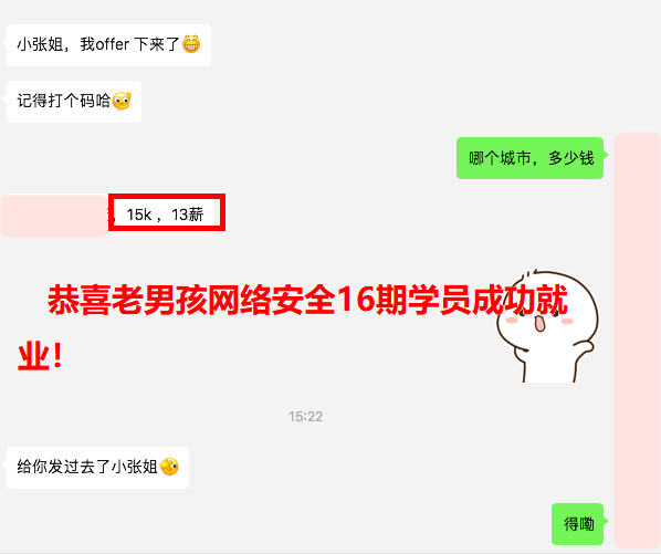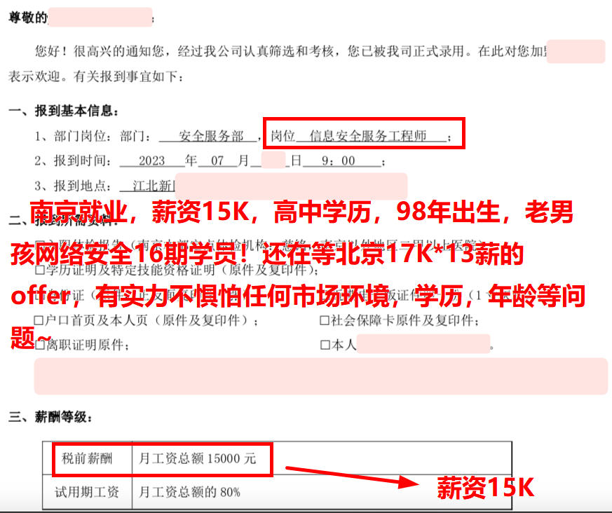 南京就业,薪资15K,高中学历,98年出生,老男孩网络安全16期学员!还在等北京17K*13薪的offer,有实力不惧怕任何市场环境,学历,年龄等问题~