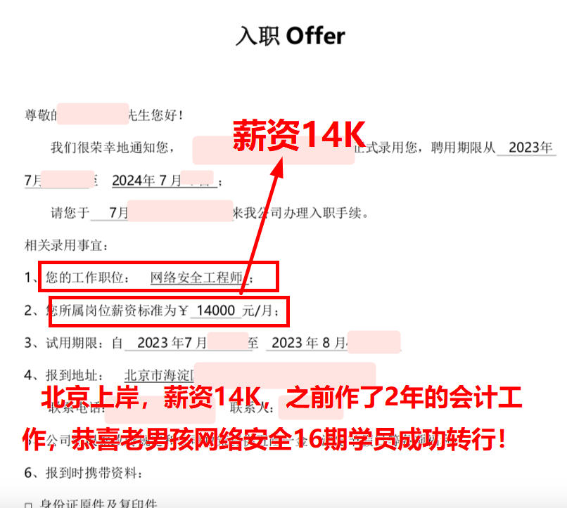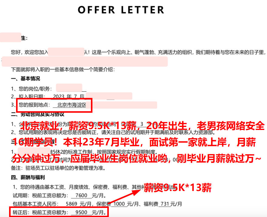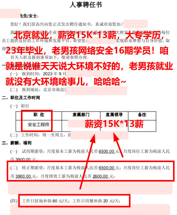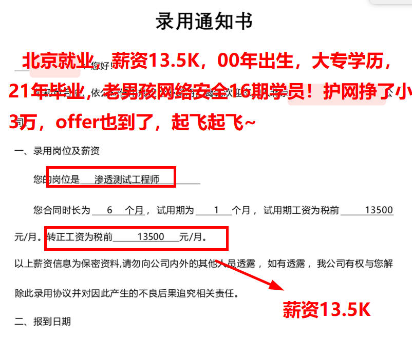 北京就业,薪资13.5K,00年出生,大专学历,21年毕业,老男孩网络安全16期学员!护网挣了小3万,offer也到了,起飞起飞~