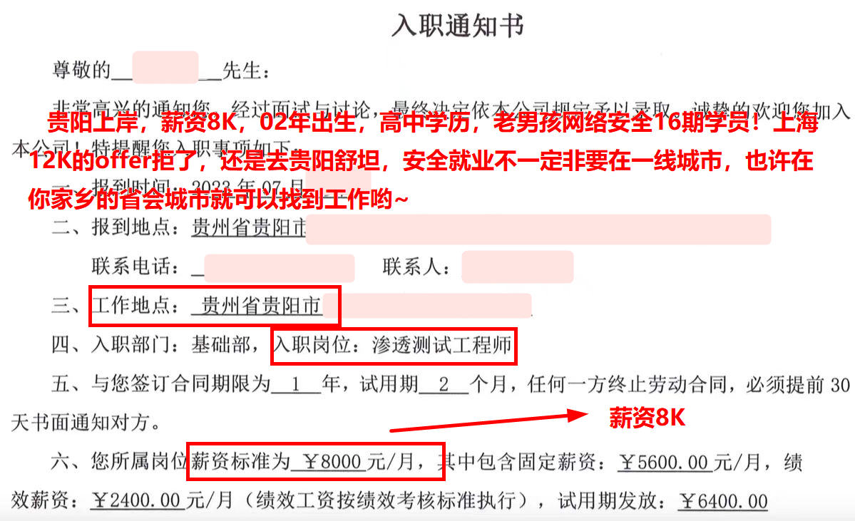贵阳上岸,薪资8K,02年出生,高中学历,老男孩网络安全16期学员!上海12K的offer拒了,还是去贵阳舒坦,安全就业不一定非要在一线城市,也许在你家乡的省会城市就可以找到工作哟~