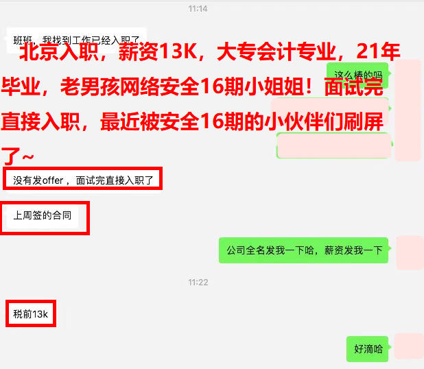 北京入职,薪资13K,大专会计专业,21年毕业,老男孩网络安全16期小姐姐!面试完直接入职,最近被安全16期的小伙伴们刷屏了~