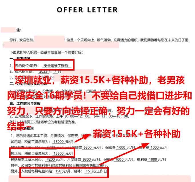 深圳就业,薪资15.5K+各种补助,老男孩网络安全16期学员!不要给自己找借口进步和努力,只要方向选择正确,努力一定会有好的结果~