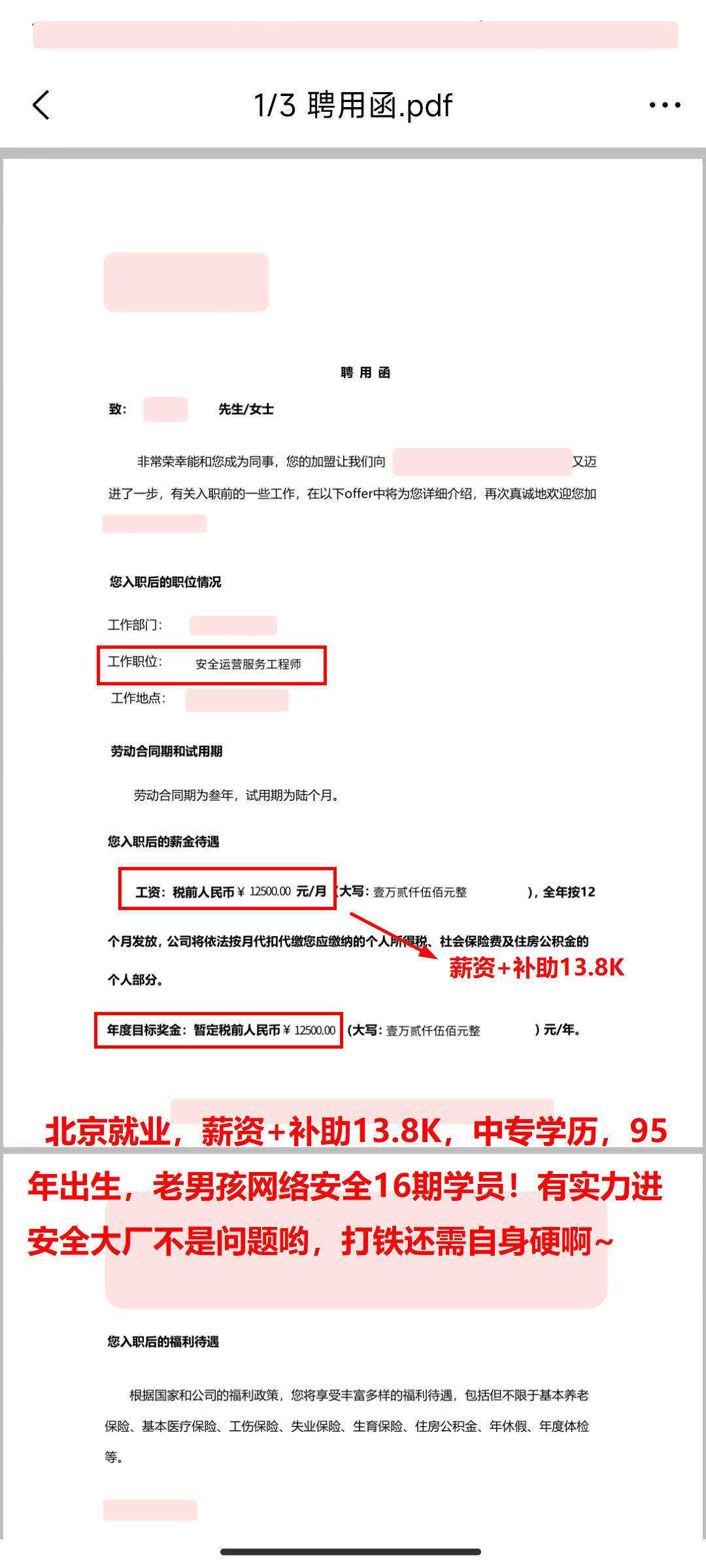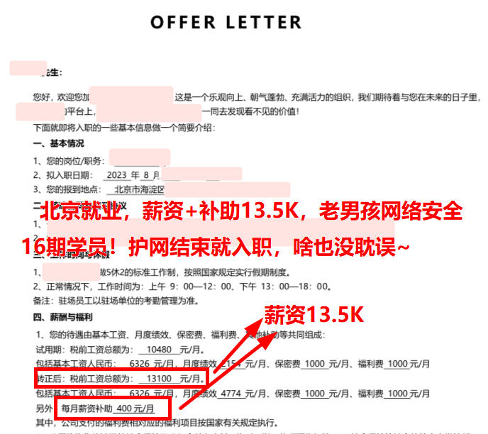 北京就业,薪资+补助13K*14薪,学前教育专业,老男孩网络安全16期学员!还有个国企的offer,选择选择看看去哪个~