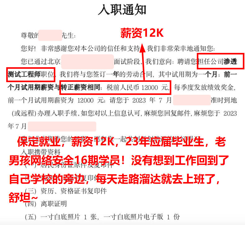 保定就业,薪资12K,23年应届毕业生,老男孩网络安全16期学员!没有想到工作回到了自己学校的旁边,每天走路溜达就去上班了,舒坦~