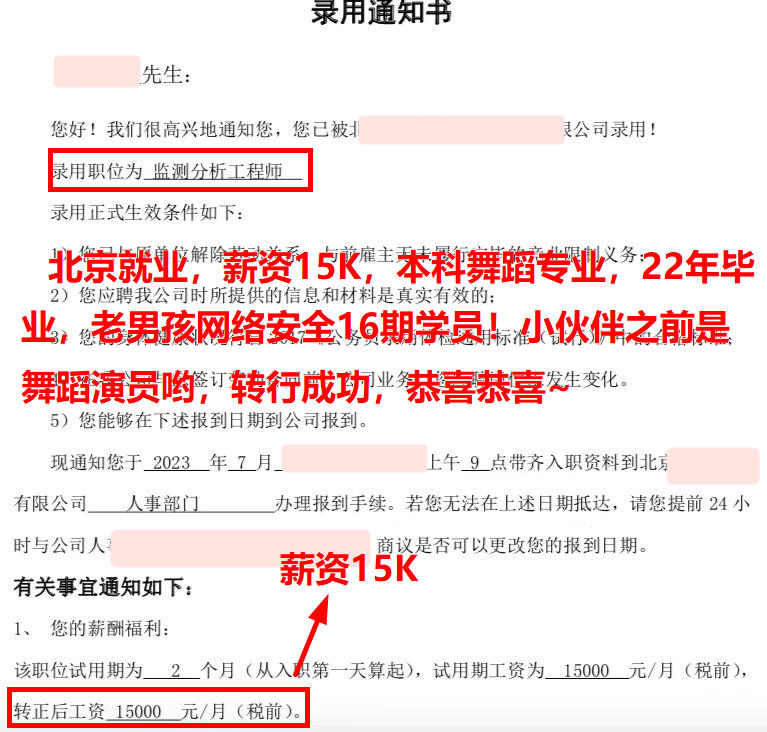 北京就业,薪资15K,本科舞蹈专业,22年毕业,老男孩网络安全16期学员!小伙伴之前是舞蹈演员哟,转行成功,恭喜恭喜~