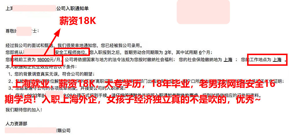 上海就业,薪资18K,大专学历,18年毕业,老男孩网络安全16期学员!入职上海外企,女孩子经济独立真的不是吹的,优秀~