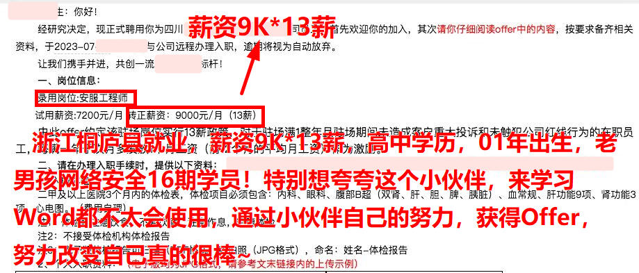 浙江桐庐县就业,薪资9K*13薪,高中学历,01年出生,老男孩网络安全16期学员!特别想夸夸这个小伙伴,来学习Word都不太会使用,通过小伙伴自己的努力,获得Offer,努力改变自己真的很棒~