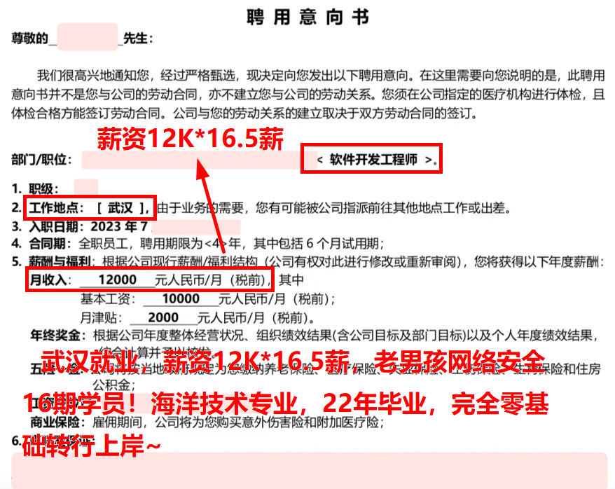 武汉就业,薪资12K*16.5薪,老男孩网络安全16期学员!海洋技术专业,22年毕业,完全零基础转行上岸~