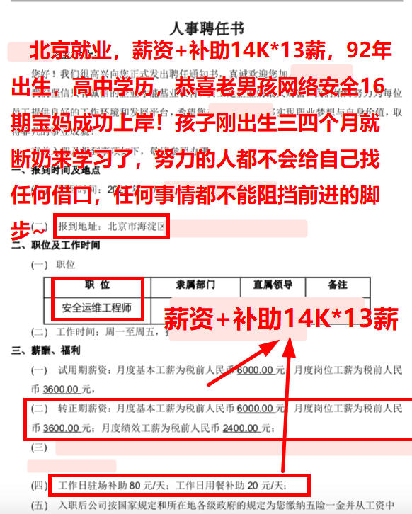 北京就业,薪资+补助14K*13薪,92年出生,高中学历,恭喜老男孩网络安全16期宝妈成功上岸!孩子刚出生三四个月就断奶来学习了,努力的人都不会给自己找任何借口,任何事情都不能阻挡前进的脚步~