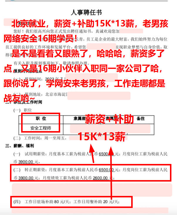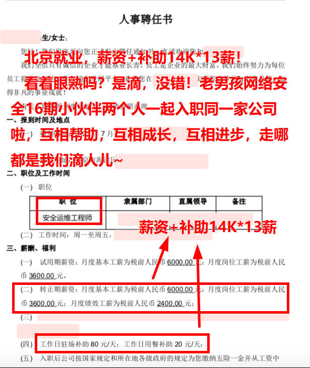 北京就业,薪资+补助13.5K,老男孩网络安全16期学员!护网结束就入职,啥也没耽误~