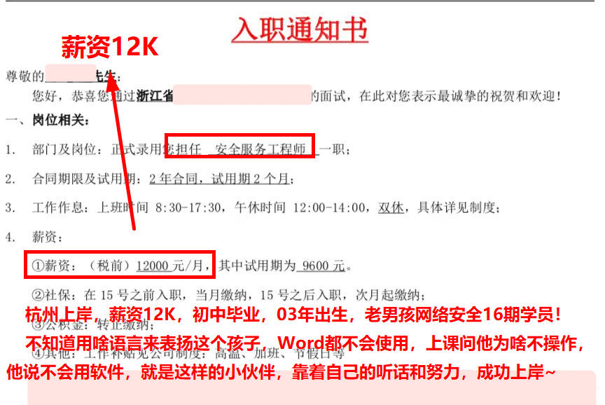 杭州上岸,薪资12K,初中毕业,03年出生,老男孩网络安全16期学员!