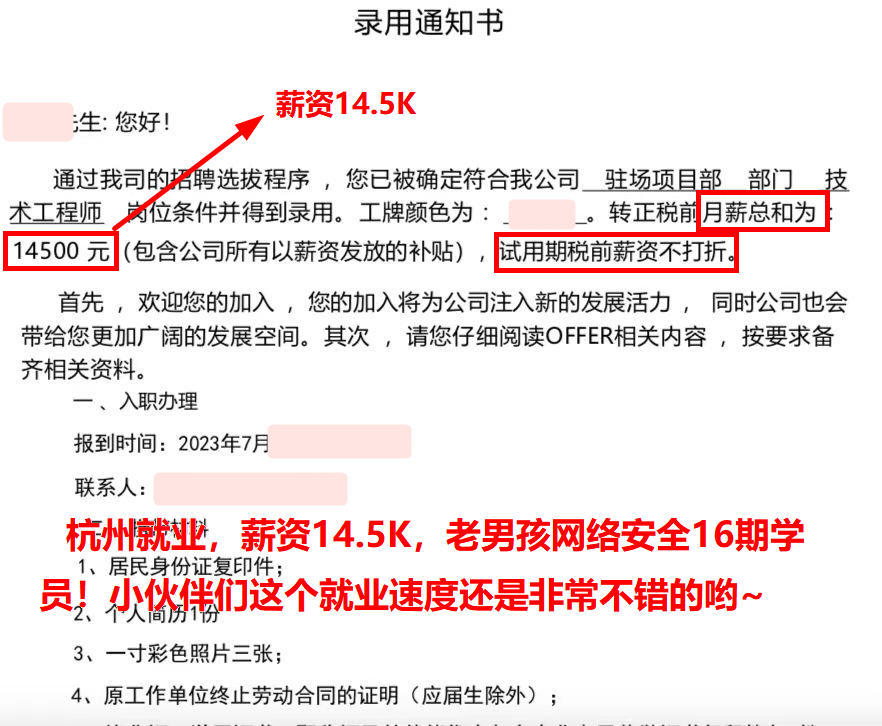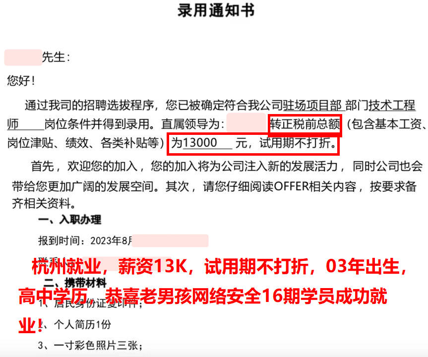 杭州就业,薪资13K,试用期不打折,03年出生,高中学历,恭喜老男孩网络安全16期学员成功就业!