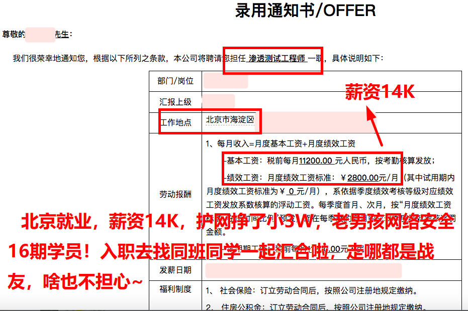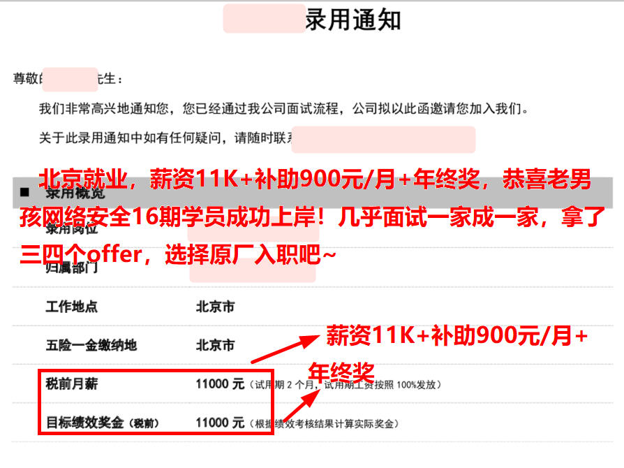 北京就业,薪资11K+补助900元/月+年终奖,恭喜老男孩网络安全16期学员成功上岸!几乎面试一家成一家,拿了三四个offer,选择原厂入职吧~