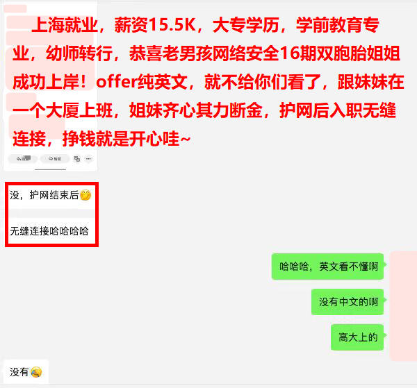 上海就业,薪资15.5K,大专学历,学前教育专业,幼师转行,恭喜老男孩网络安全16期双胞胎姐姐成功上岸!offer纯英文,就不给你们看了,跟妹妹在一个大厦上班,姐妹齐心其力断金,护网后入职无缝连接,挣钱就是开心哇~