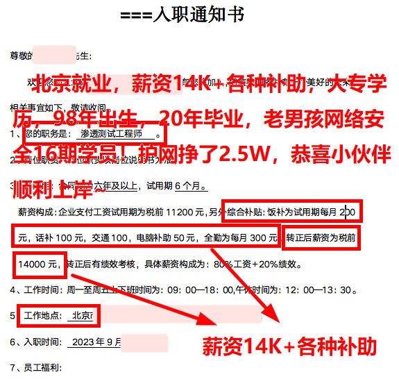 北京就业,薪资14K+各种补助,大专学历,98年出生,20年毕业,老男孩网络安全16期学员!护网挣了2.5W,恭喜小伙伴顺利上岸~