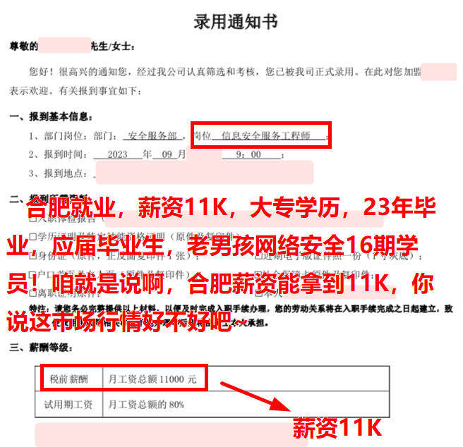 合肥就业,薪资11K,大专学历,23年毕业,应届毕业生,老男孩网络安全16期学员!咱就是说啊,合肥薪资能拿到11K,你说这市场行情好不好吧~