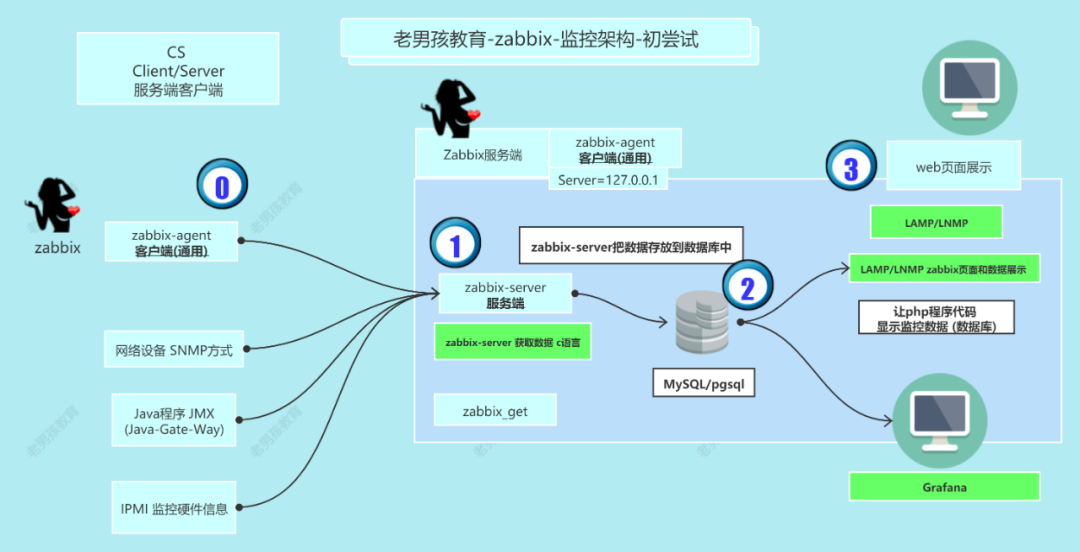 Zabbix-Agent获取数据 -发送给->Zabbix-Server服务端-数据会被存放-数据库<-Zabbix Web页面展示数据。