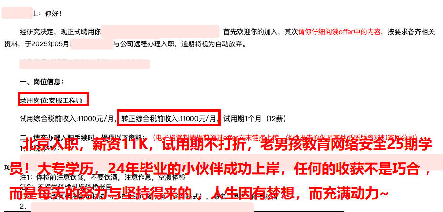 北京就业,薪资10K,本科学历,老男孩教育网络安全25期学员!25年应届毕业生,校招成功上岸安全top前3的公司,试问本科25年毕业的你现在是否已经找到工作,已经有了月薪10K的offer,是否还在迷茫,来咱们唠唠~