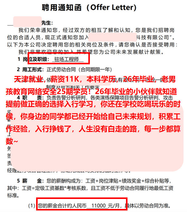 天津就业,薪资11K,本科学历,26年毕业,老男孩教育网络安全25期学员!26年毕业的小伙伴就知道提前做正确的选择入行学习,你还在学校吃喝玩乐的时候,你身边的同学都已经开始给自己未来规划,积累工作经验,入行挣钱了,人生没有白走的路,每一步都算数~