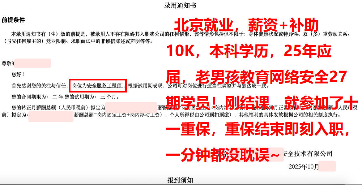 北京就业,薪资+补助10K,本科学历,25年应届,老男孩教育网络安全27期学员!刚结课,就参加了十一重保,重保结束即刻入职,一分钟都没耽误~
