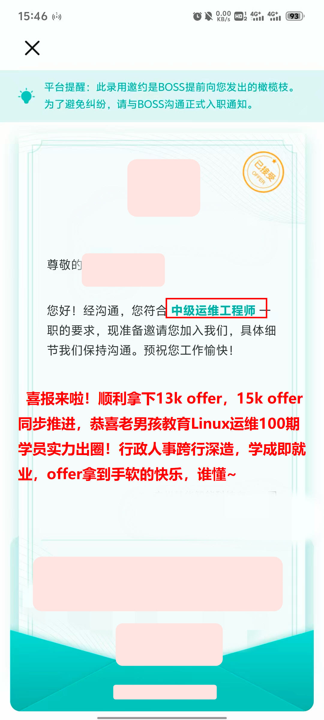 喜报来啦!顺利拿下13k offer,15k offer同步推进,恭喜老男孩教育Linux运维100期学员实力出圈!行政人事跨行深造,学成即就业,offer拿到手软的快乐,谁懂~