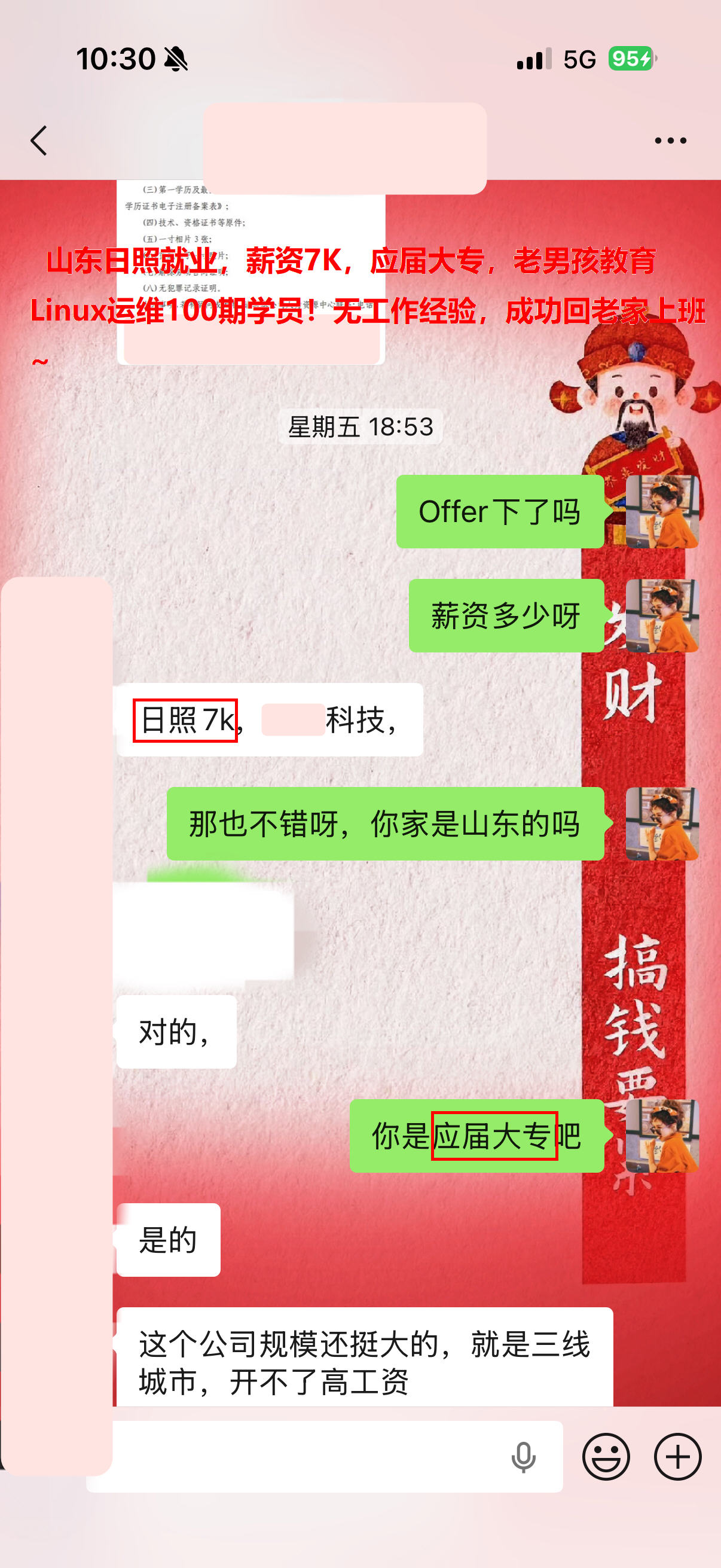 山东日照就业,薪资7K,应届大专,老男孩教育Linux运维100期学员!无工作经验,成功回老家上班~
