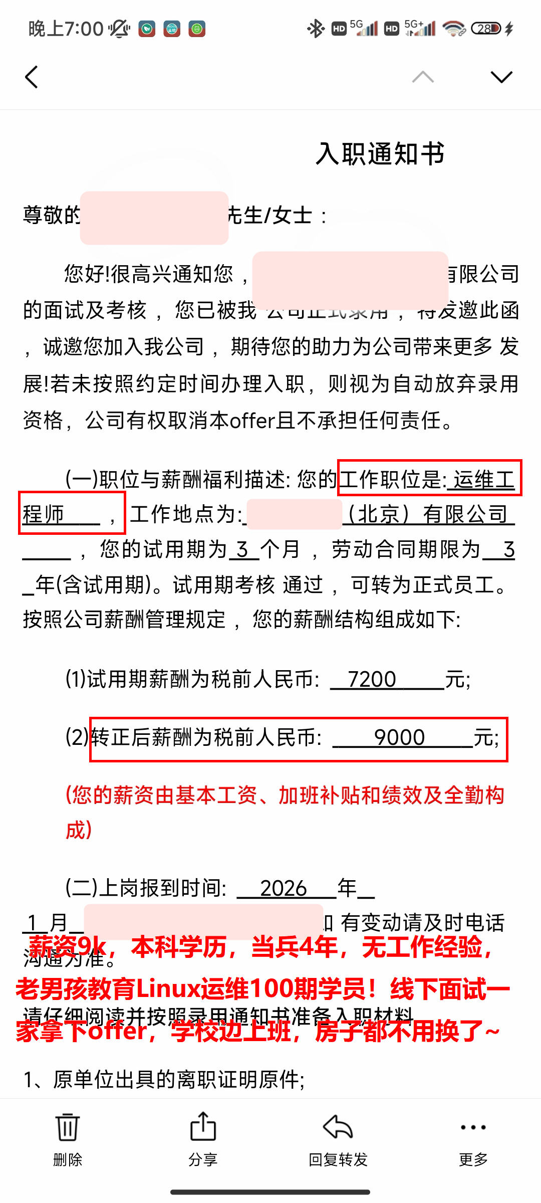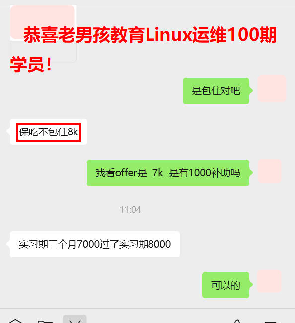 薪资9k,本科学历,当兵4年,无工作经验,老男孩教育Linux运维100期学员!线下面试一家拿下offer,学校边上班,房子都不用换了~