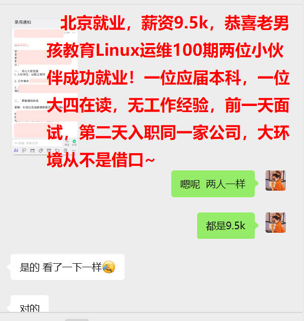 北京就业,薪资9.5k,恭喜老男孩教育Linux运维100期两位小伙伴成功就业!一位应届本科,一位大四在读,无工作经验,前一天面试,第二天入职同一家公司,大环境从不是借口~
