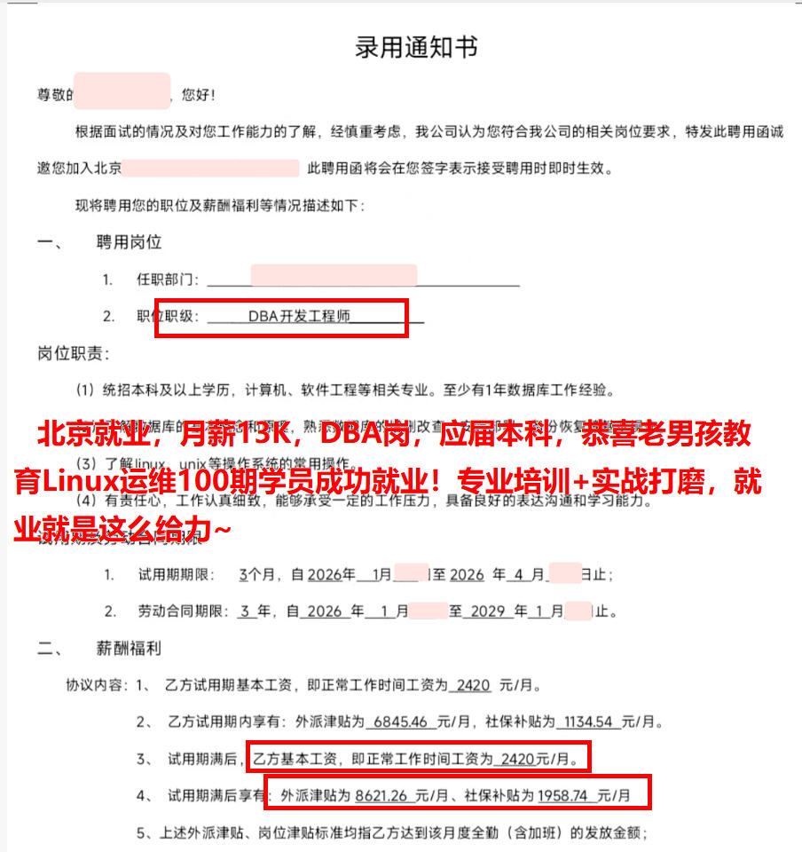北京就业,月薪13K,DBA岗,应届本科,恭喜老男孩教育Linux运维100期学员成功就业!专业培训+实战打磨,就业就是这么给力~