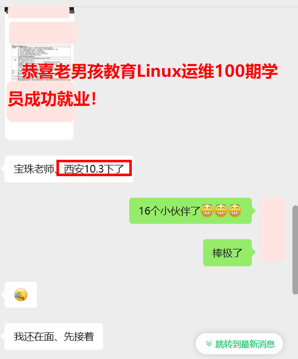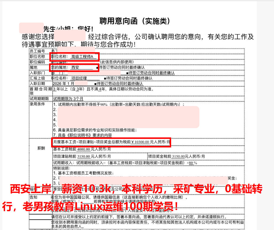 西安上岸,薪资10.3k,本科学历,采矿专业,0基础转行,老男孩教育Linux运维100期学员!