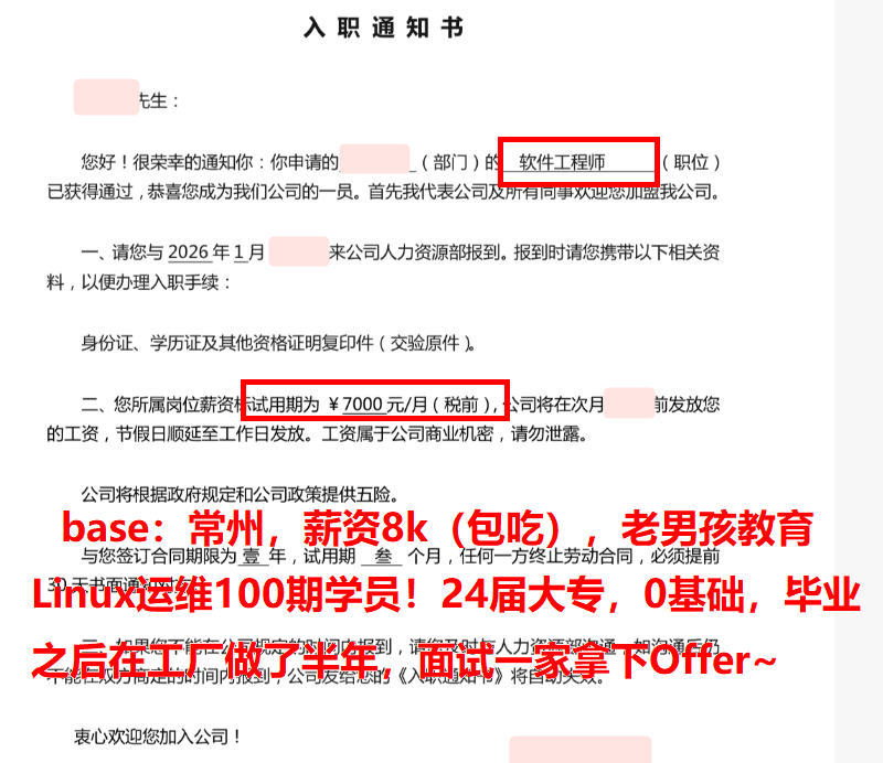 base:常州,薪资8k(包吃),老男孩教育Linux运维100期学员!24届大专,0基础,毕业之后在工厂做了半年,面试一家拿下Offer~