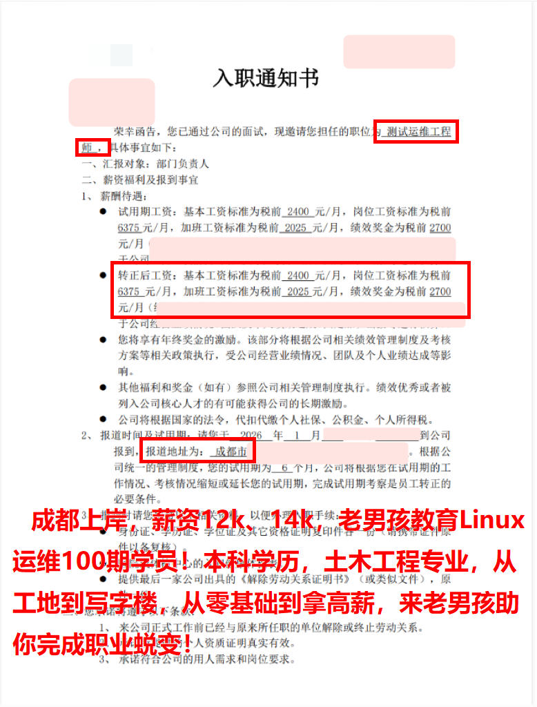 成都上岸,薪资12k、14k,老男孩教育Linux运维100期学员!本科学历,土木工程专业,从工地到写字楼,从零基础到拿高薪,来老男孩助你完成职业蜕变!