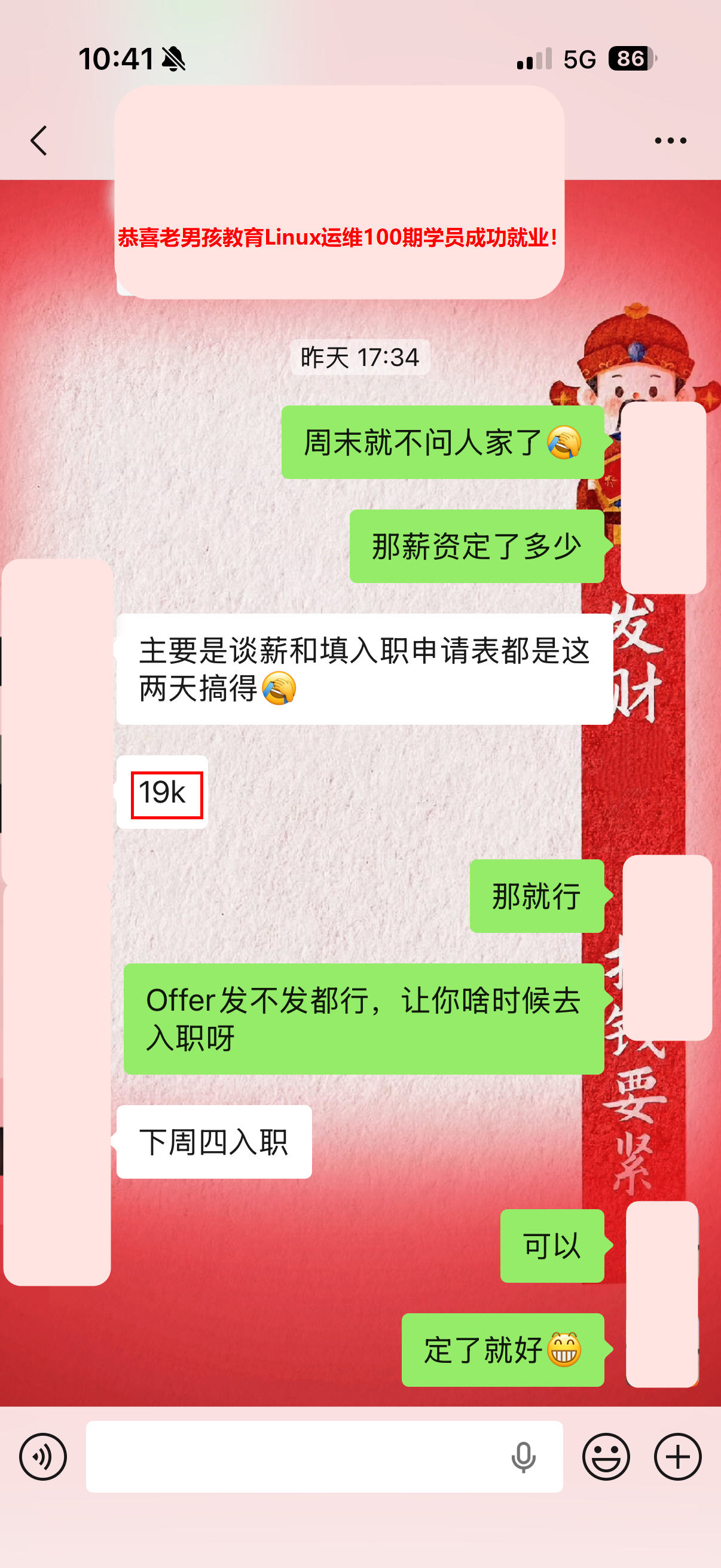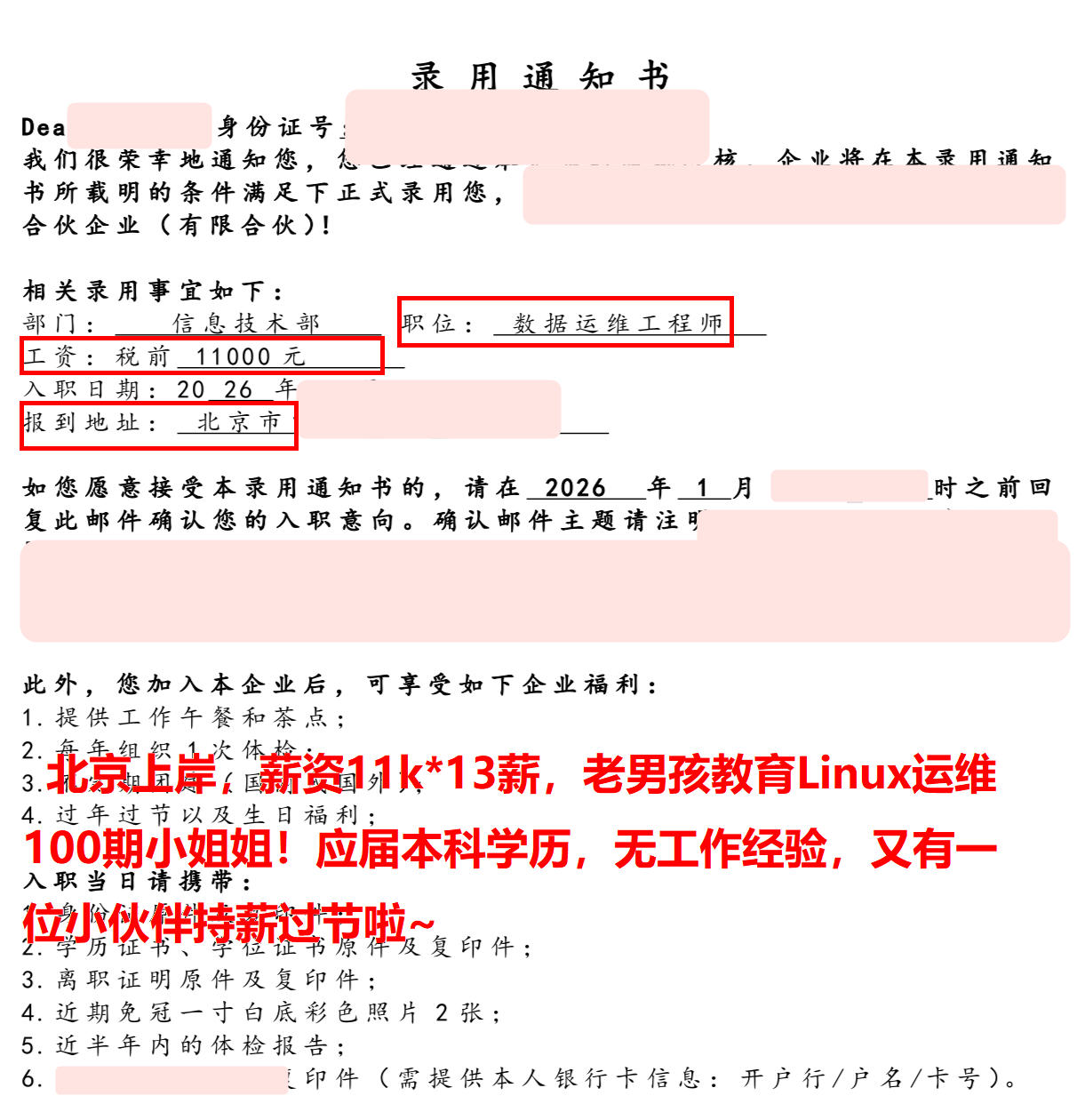北京上岸,薪资11k*13薪,老男孩教育Linux运维100期小姐姐!应届本科学历,无工作经验,又有一位小伙伴持薪过节啦~