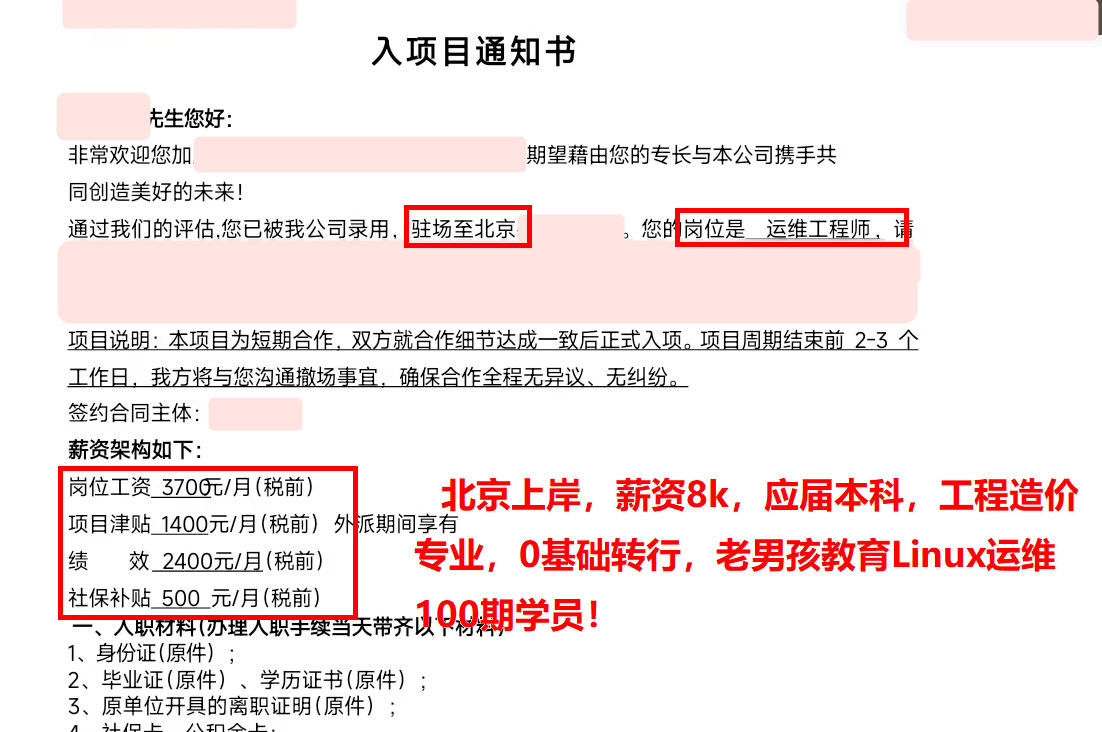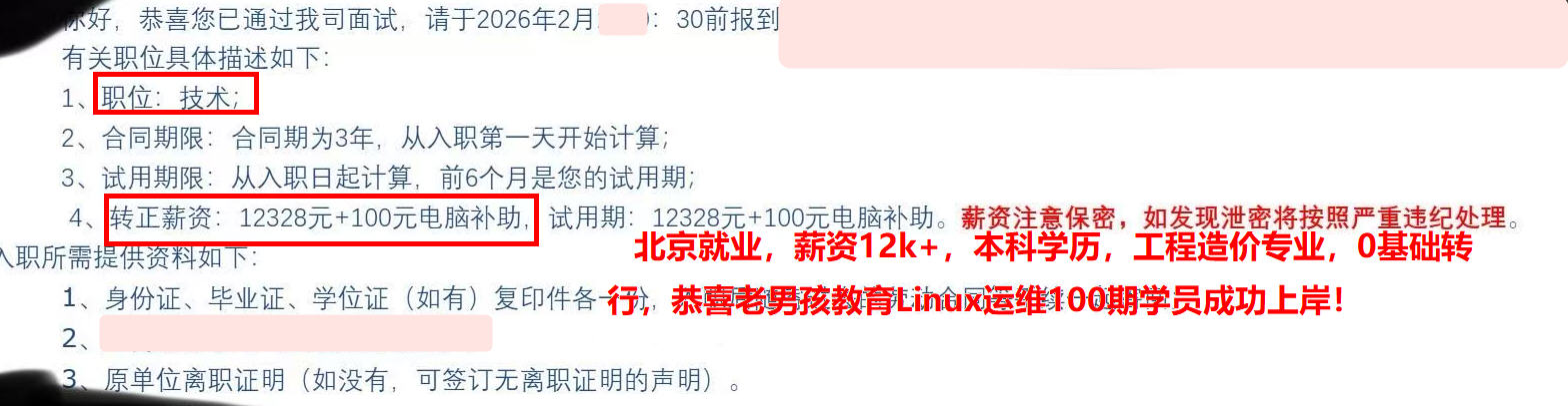 北京上岸,薪资8k,应届本科,工程造价专业,0基础转行,老男孩教育Linux运维100期学员!