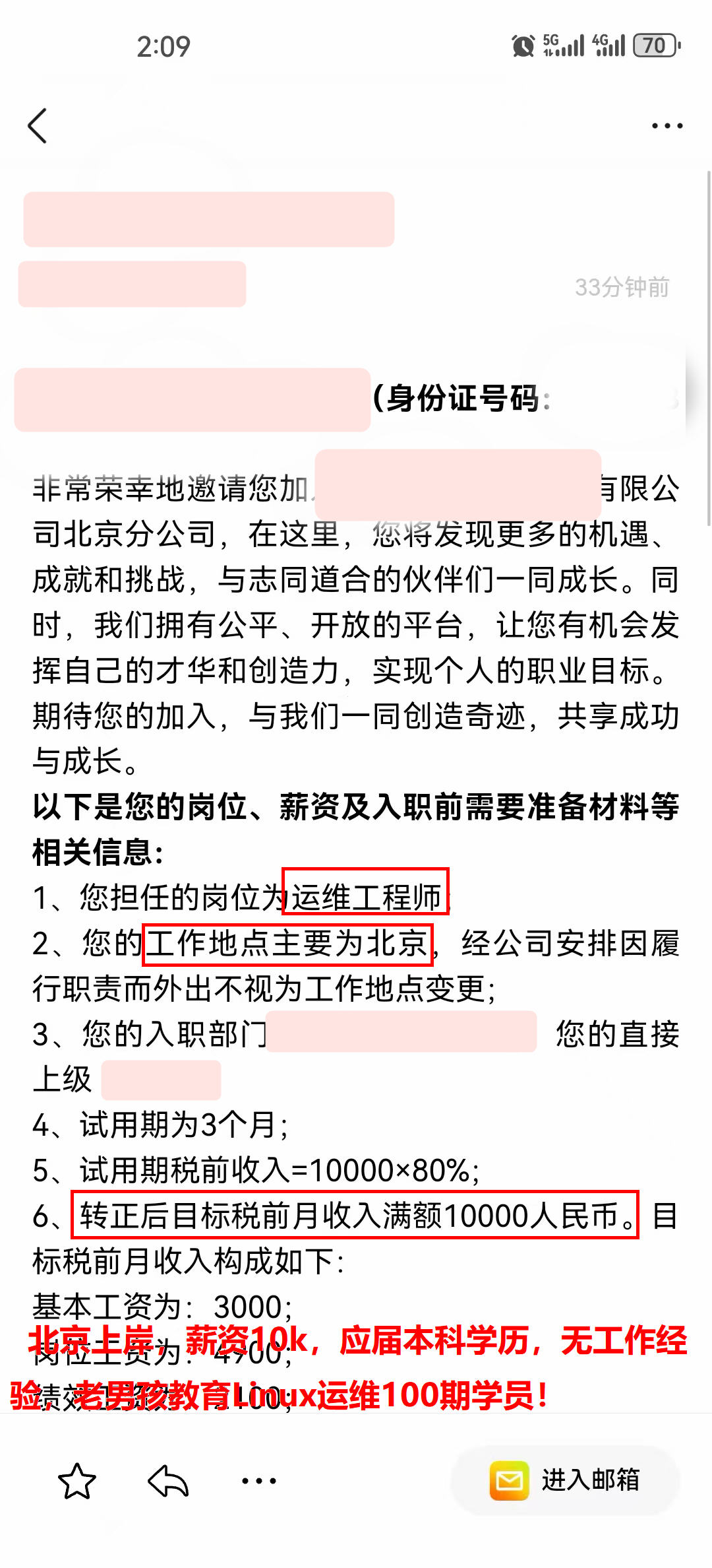 北京上岸,薪资10k,应届本科学历,无工作经验,老男孩教育Linux运维100期学员!