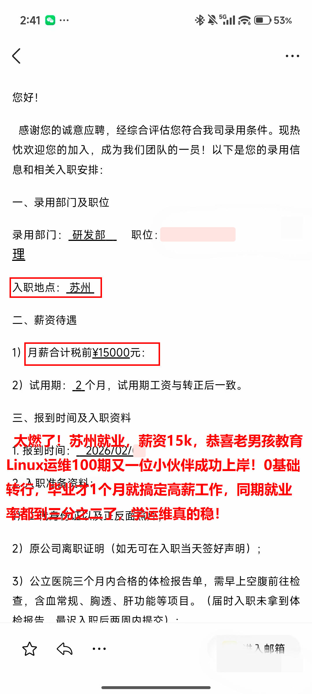 太燃了!苏州就业,薪资15k,恭喜老男孩教育Linux运维100期又一位小伙伴成功上岸!0基础转行,毕业才1个月就搞定高薪工作,同期就业率都到三分之二了,学运维真的稳!